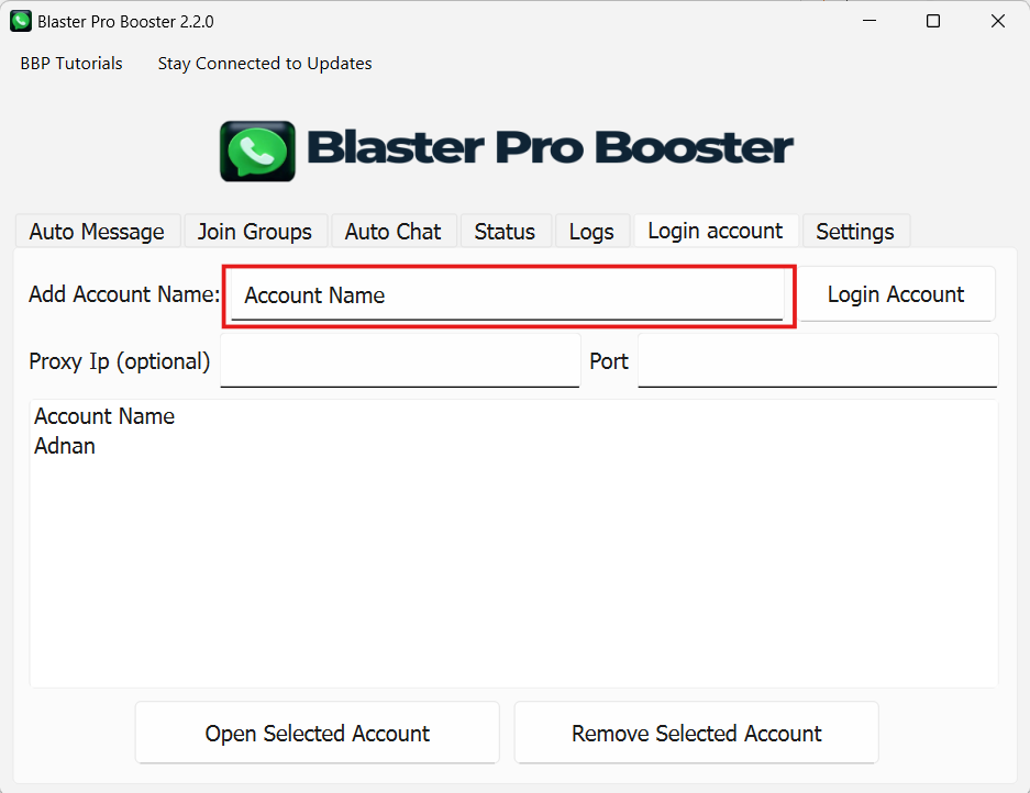 - In the Account Name field, assign a custom name to your WhatsApp account for easier management within the software.