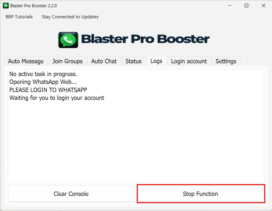 - After you click on Login Account, the software will redirect you to the Logs tab. Here, you will see two buttons, one of which is Stop Function.