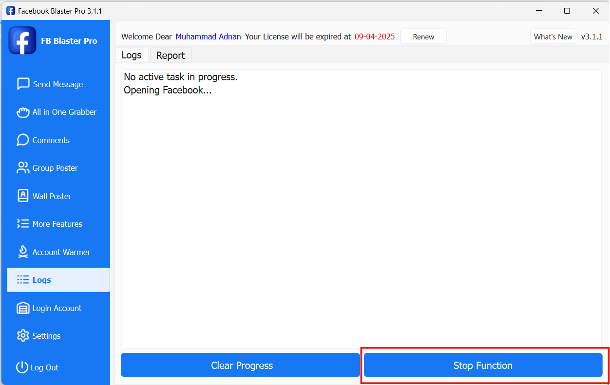 - After you click on Login Account, the software will redirect you to the Logs tab. Here, you will see two buttons, one of which is Stop Function.