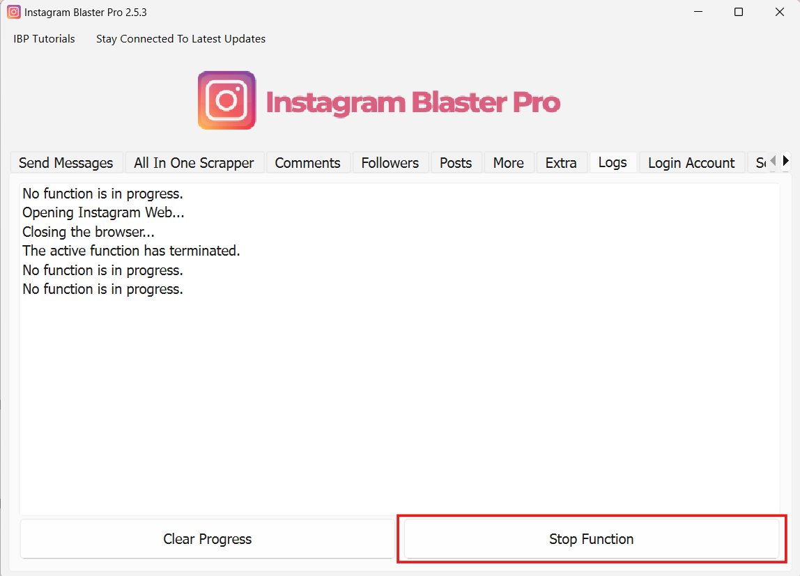 - After you click on Login Account, the software will redirect you to the Logs tab. Here, you will see two buttons, one of which is Stop Function.