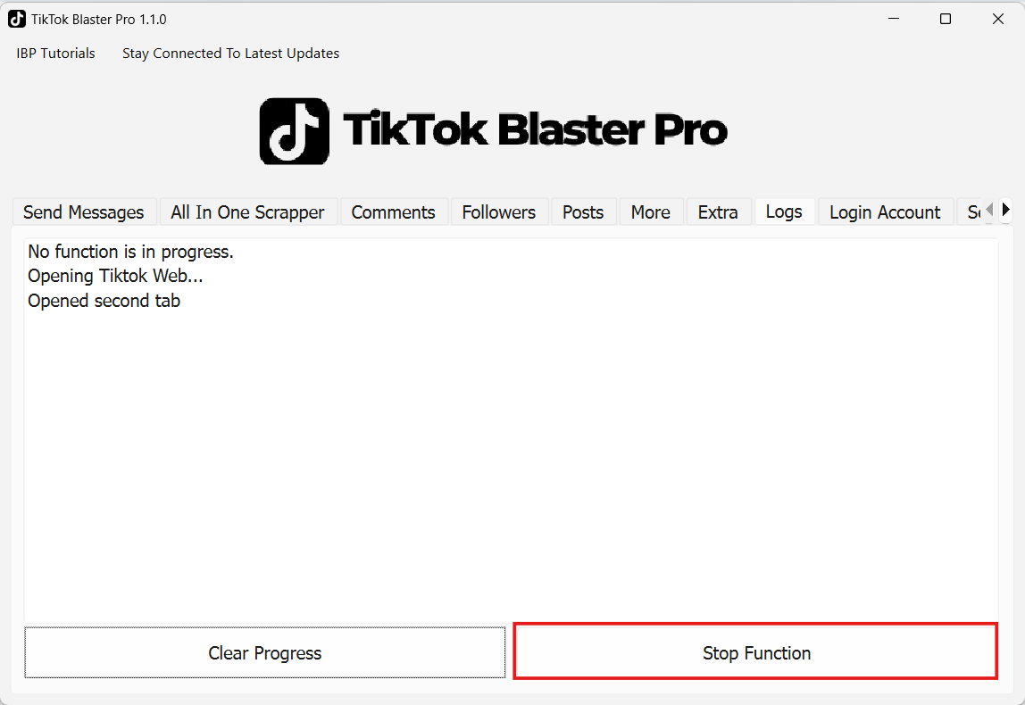 - After you click on Login Account, the software will redirect you to the Logs tab. Here, you will see two buttons, one of which is Stop Function.
